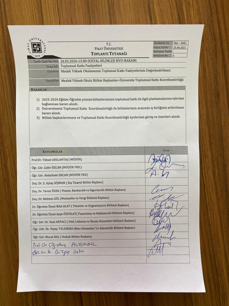 F.Ü. Toplumsal Katkı Koordinatörlüğü tarafından, 2026 dönemi faaliyetlerine ilişkin Sosyal Bilimler MYO’ya yönelik bilgilendirme toplantısı gerçekleştirildi. Toplantı, üniversitemizin toplumsal katkı faaliyetlerinin daha etkin, planlı ve sürdürülebilir bir şekilde yürütülmesi, MYO bünyesinde gerçekleştirilen mevcut çalışmaların değerlendirilmesi ve yeni dönem planlamalarının yapılması amacıyla düzenlendi. Bu kapsamda, toplumsal katkı birimi altında yer alan faaliyet alanları, bu kapsama giren çalışmaların içeriği, izlenecek süreçlere ilişkin usul ve esaslar ile iletilecek formlar hakkında paylaşımda bulunuldu.